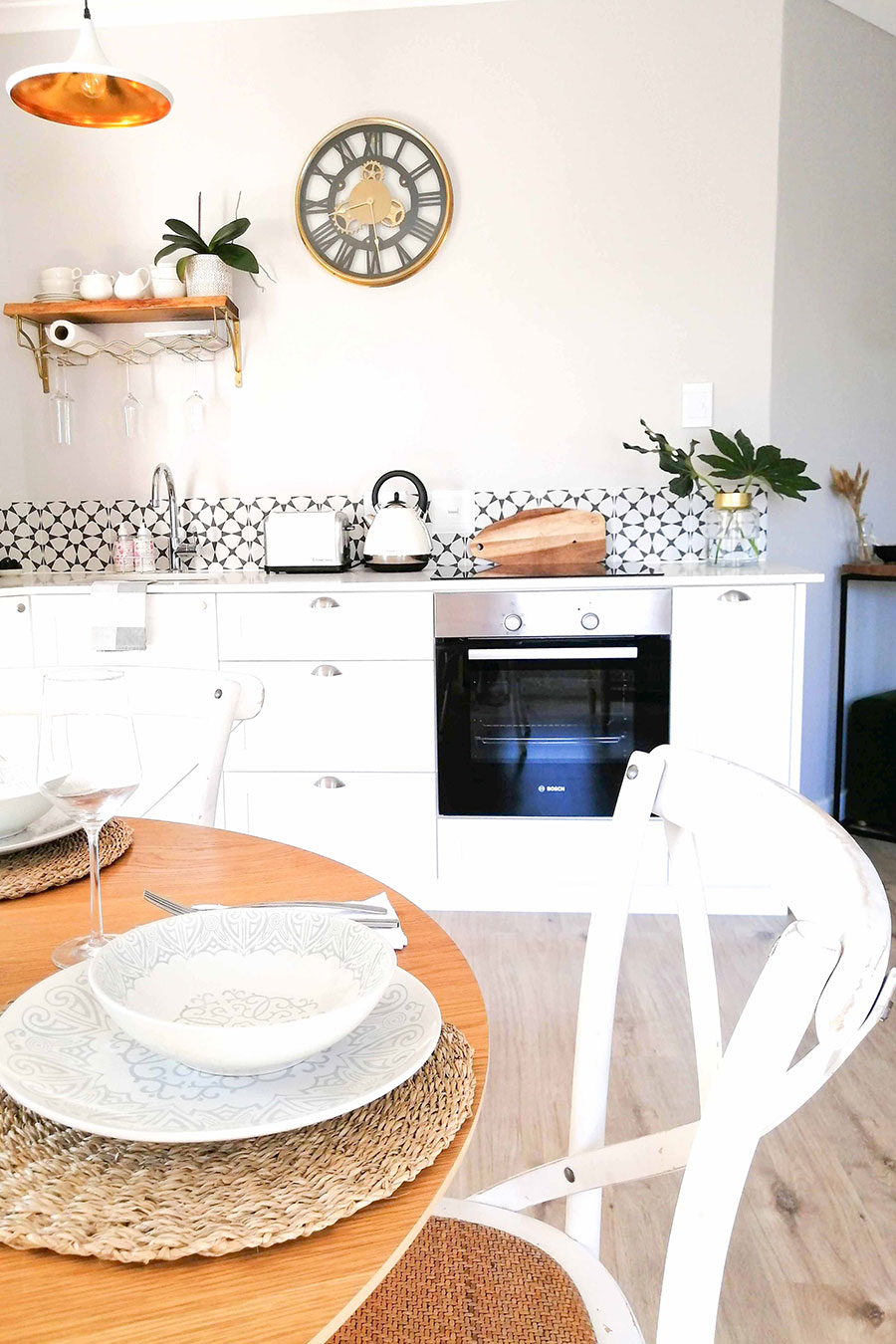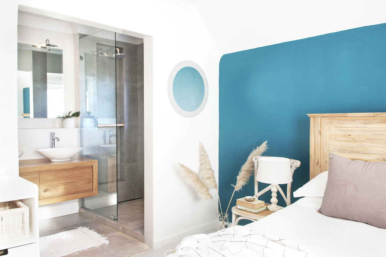 This one-bedroom apartment in heart of beautiful Stellenbosch has been transformed into a simple and modern space, with a twist of colour and texture. The main living space has windows that fill it with an abundance of natural light. Calming sage tones can sit alongside almost any color without competing, while a deep teal can enhance contrast in an entire space. Adding greens never feels wrong because we see this organically in nature.